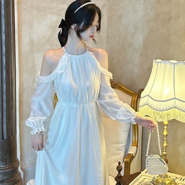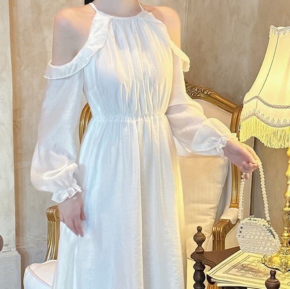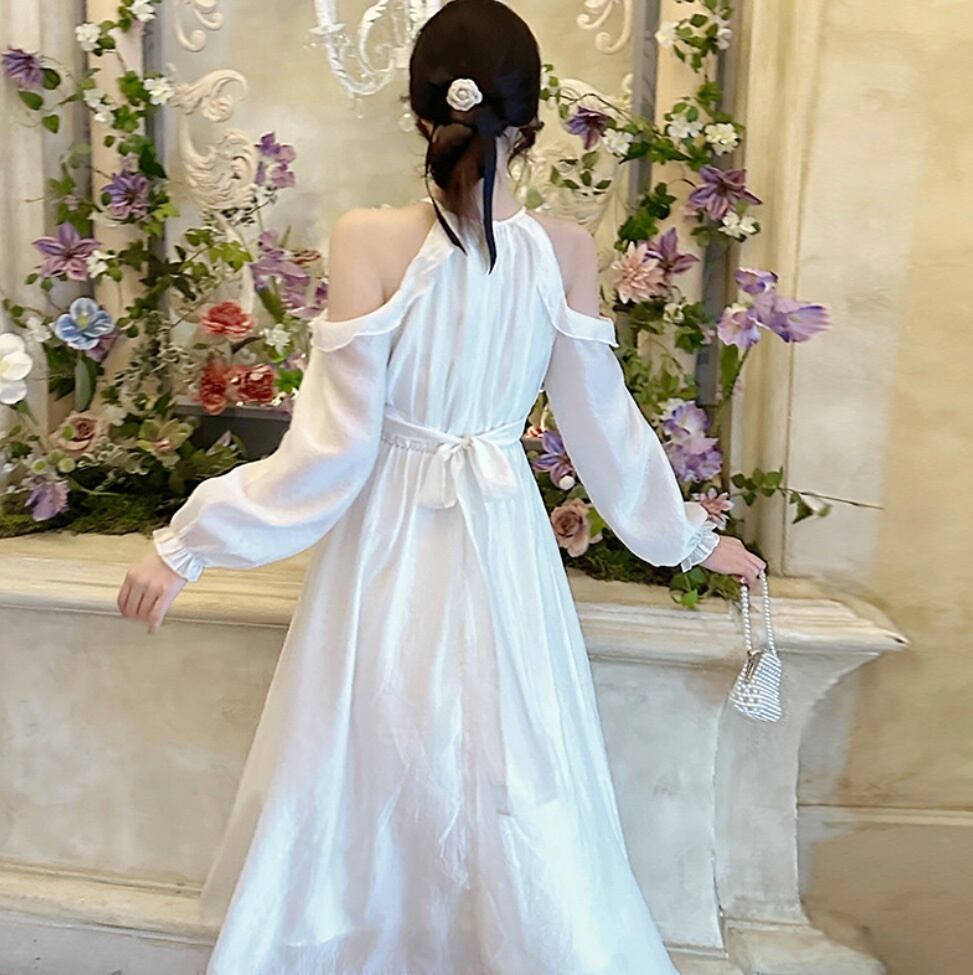 ワンピース ロング 長袖 ドロップショルダー オープンショルダー ホルター セミフレア タイト スリム 細身 フェミニン バックリボン ハイウエスト かわいい 大人可愛い 上品 おしゃれ かっこいい レトロ ガーリー 存在感 かっちり ラブリー キュート ロリータ 都会的 クラシカル ロマンティック ナチュラル セクシー 無地 春 夏 秋 お出かけ パーティー イベント デート 女子会 休日 普段使い 着回し モテ 清楚 トレンド 流行 インスタ映え S M L XL 白 ホワイト ベーシックカラー