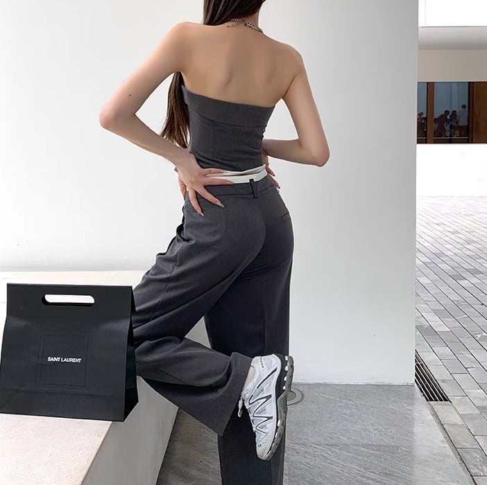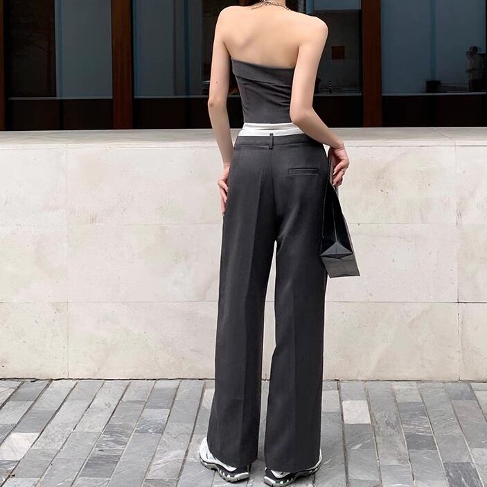 上下セット 2点セット トップス ベアトップ パンツ ボトムス セットアップ レディース ストレートパンツ ロングパンツ タックパンツ スラックス 袖なし ノースリーブ スクエアネック タイト スリム 細身 背中開き タック 大人可愛い おしゃれ こなれ感 マニッシュ ガーリー 個性的 クール モード系 モダン 存在感 抜け感 ラブリー キュート 都会的 ラグジュアリー アクティブ 無地 夏 お出かけ パーティー イベント レストラン 休日 美脚 脚長 トレンド 流行 インスタ映え S M L グレー