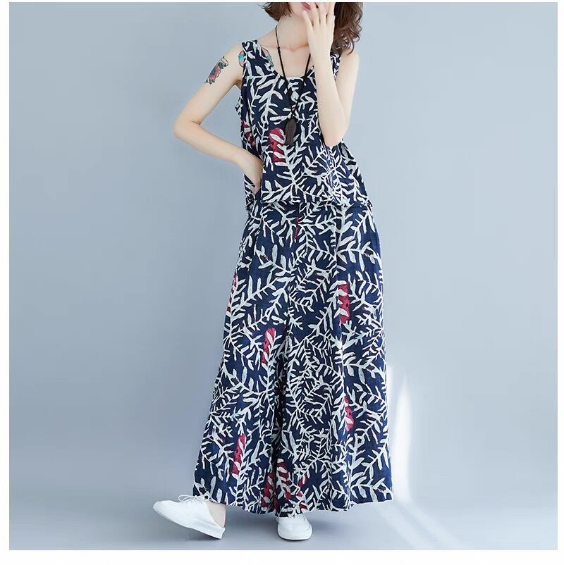 上下セット 2点セット トップス パンツ ボトムス レディース ガウチョパンツ ストレートパンツ ロングパンツ ワイドパンツ タンクトップ アンクル丈 袖なし ノースリーブ ラウンドネック オーバーサイズ ストリート ハイウエスト カジュアル おしゃれ かっこいい レトロ アジアン エスニック エキゾチック こなれ感 ラフ 個性的 クール 総柄 夏 お出かけ リゾート 旅行 ビーチ 休日 バカンス 重ね着 楽ちん 体型カバー 普段使い 着回し レイヤード インスタ映え M L XL 2XL ネイビー
