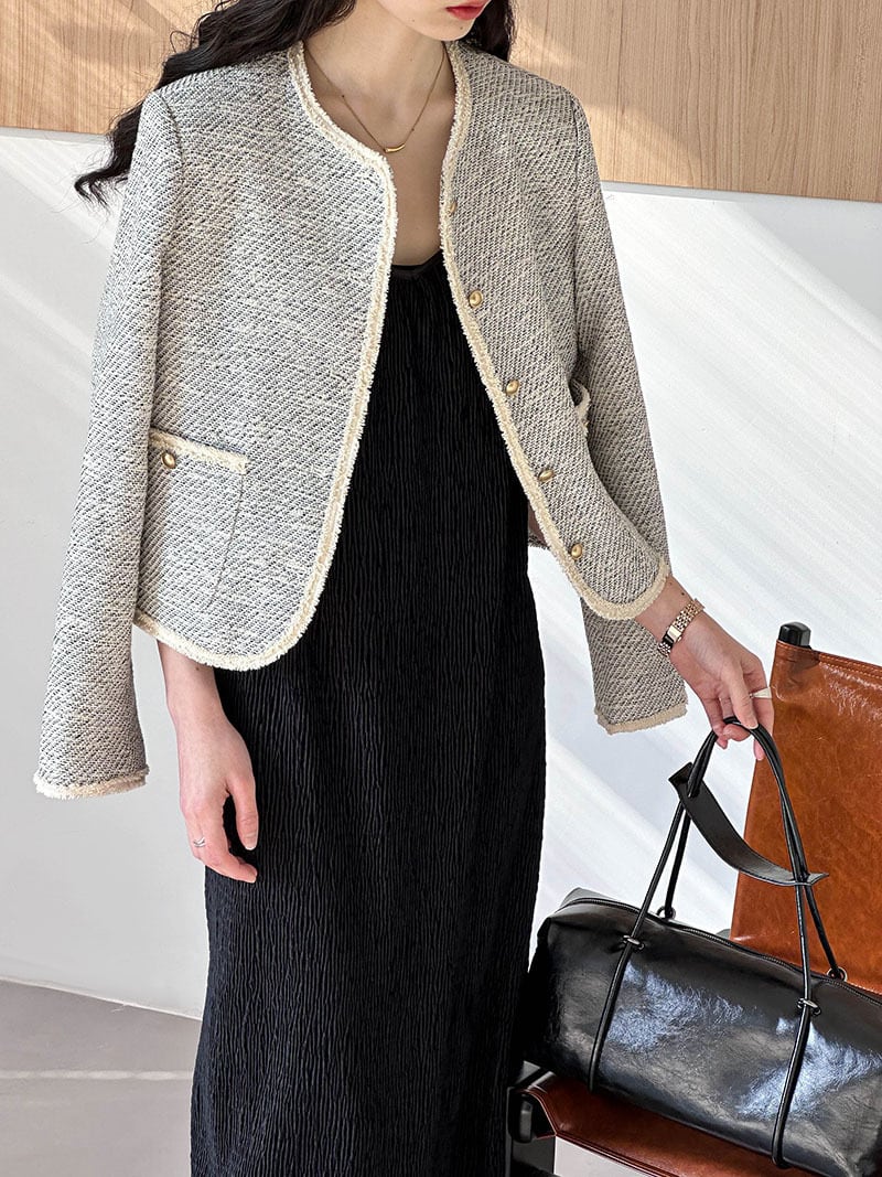 アウター ジャケット 長袖 ラウンドネック 前開き デザインボタン ポケット ミディアム丈 かわいい 大人可愛い きれいめ シンプル 上品 おしゃれ かっこいい カジュアル こなれ感 個性的 レトロ きちんと 主役級 存在感 抜け感 秋 冬 ベーシック ナチュラル キュート クール エレガント フォーマル レディース 女性用 ママ OL 通勤 デート お出かけ お泊まり 女子会 旅行 休日 アウトドア カフェ ショッピング コンパ レストラン 普段使い 着回し 重ね着 デイリー ワンサイズ 高見え
