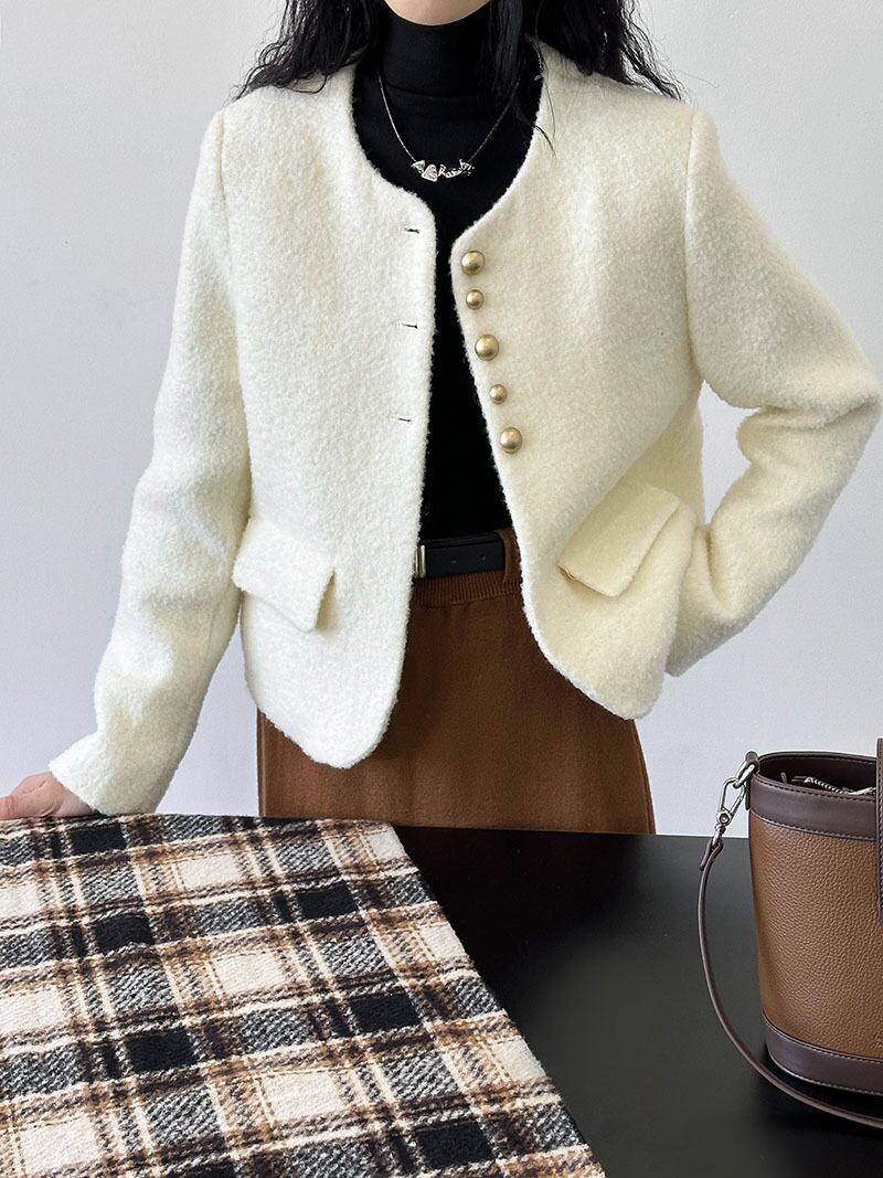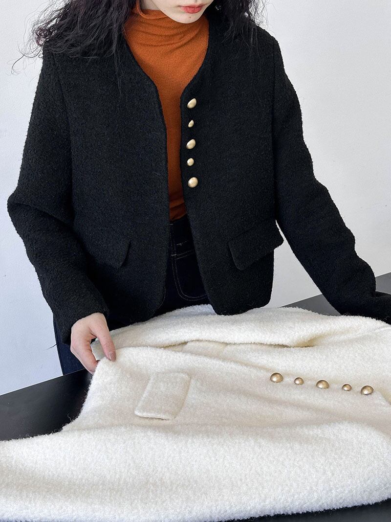 アウター ジャケット レディース ノーカラージャケット 長袖 ラウンドネック 前開き デザインボタン ポケット ショート丈 かわいい 大人可愛い きれいめ シンプル 上品 おしゃれ かっこいい カジュアル こなれ感 個性的 きちんと 主役級 存在感 抜け感 秋 冬 ベーシック ナチュラル キュート フォーマル レディース 女性用 ママ OL 通勤 オフィス 学生 通学 デート お出かけ お泊まり 女子会 旅行 休日 カフェ ショッピング コンパ レストラン 普段使い 着回し 重ね着 デイリー M L