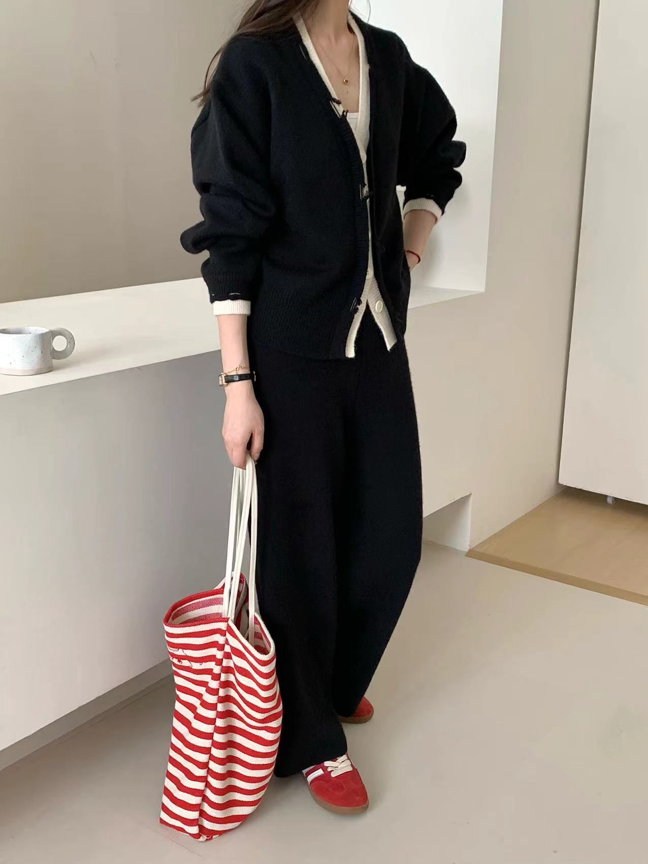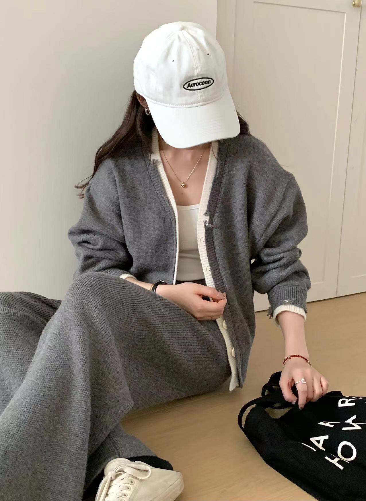 2点セット セットアップ 上下セット レディース カーディガン 長袖 Vネック 前開き ボタン 重ね着風 ダメージ加工 ロングスパンツ ウエストゴム かわいい 大人可愛い きれいめ シンプル 上品 おしゃれ かっこいい カジュアル こなれ感 個性的 主役級 存在感 抜け感 秋 冬 ベーシック ナチュラル クール キュート 無地 女性用 ママ OL 学生 通学 デート お出かけ お泊まり 女子会 旅行 休日 カフェ ショッピング コンパ レストラン 普段使い 着回し レイヤード 重ね着 ワンサイズ