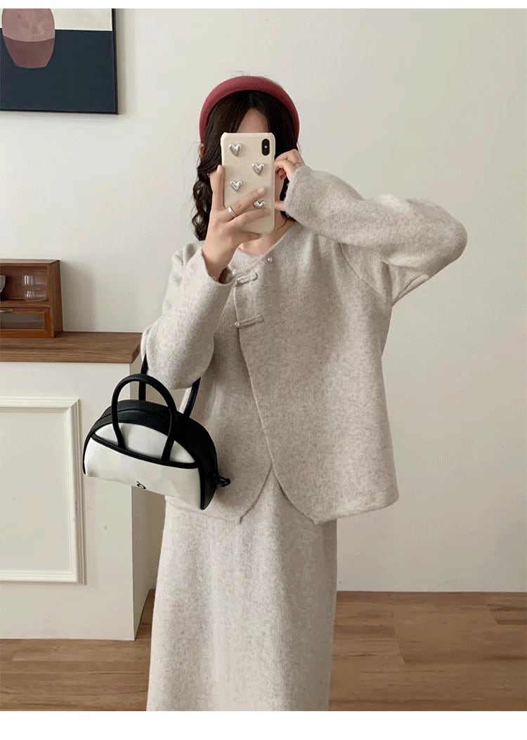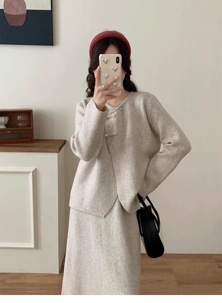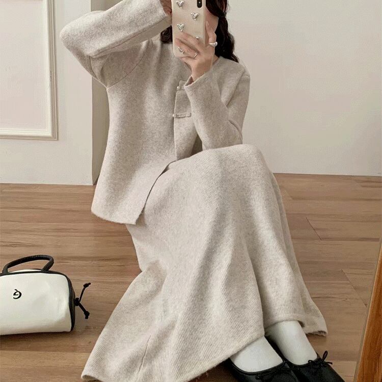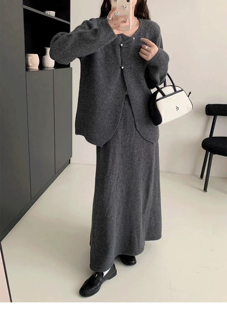 2点セット セットアップ 上下セット レディース カーディガン 長袖 前開き デザインボタン アシンメトリー ロングスカート ウエストゴム セミフレア かわいい 大人可愛い きれいめ シンプル 上品 おしゃれ かっこいい カジュアル こなれ感 個性的 主役級 存在感 抜け感 秋 冬 ベーシック ナチュラル クール キュート 無地 女性用 ママ OL 学生 通学 デート お出かけ お泊まり 女子会 旅行 休日 カフェ ショッピング コンパ レストラン 普段使い 着回し レイヤード 重ね着 ワンサイズ
