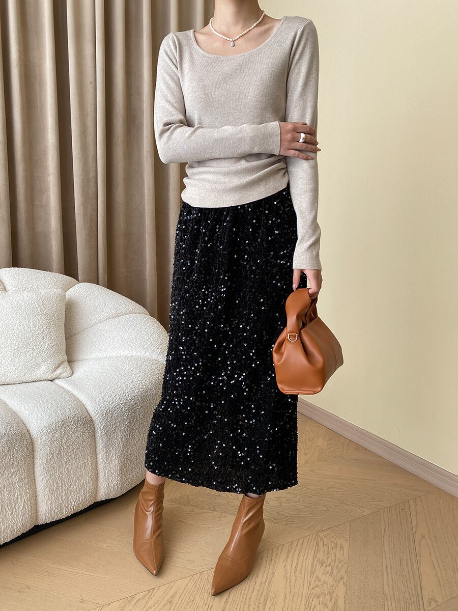 ボトムス スカート ロングスカート レディース タイトスカート ロング丈 スパンコール タイト ウエストゴム かわいい 大人可愛い きれいめ シンプル 上品 おしゃれ かっこいい カジュアル こなれ感 個性的 レトロ 主役級 存在感 抜け感 オールシーズン ベーシック ナチュラル キュート クール エレガント 無地 女性用 OL 通勤 オフィス 学生 通学 デート お出かけ お泊まり 女子会 旅行 休日 カフェ ショッピング コンパ レストラン 普段使い デイリー 着回し 脚長 M L トレンド モテ