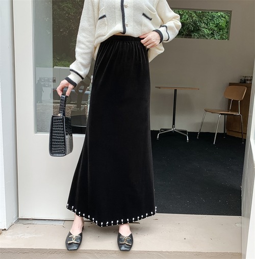ボトムス スカート ロングスカート レディース Aライン ロング丈 ハイウエスト ウエストゴム フェイクパール ベルベット かわいい 大人可愛い きれいめ シンプル 上品 おしゃれ かっこいい カジュアル こなれ感 個性的 レトロ 主役級 存在感 抜け感 秋 冬 ベーシック ナチュラル キュート クール エレガント 無地 女性用 OL 通勤 オフィス 学生 通学 デート お出かけ お泊まり 女子会 旅行 休日 カフェ ショッピング コンパ レストラン 普段使い デイリー 着回し 脚長 M L モテ