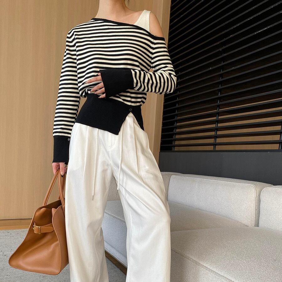 トップス カットソー レディース ニット セーター アシンメトリー 長袖 ワンショルダー ハイウエスト ボタン かわいい 大人可愛い おしゃれ かっこいい こなれ感 ラフ ガーリー 個性的 クール 存在感 抜け感 ラブリー キュート 都会的 アクティブ 無地 ボーダー デート お出かけ イベント リゾート 旅行 レストラン 休日 ショッピング 合コン コンパ カフェ モノトーン 韓国 オルチャン 普段使い 着回し レイヤード トレンド 流行 インスタ映え ゆったり ゆる フリーサイズ 黒 ブラック グレー