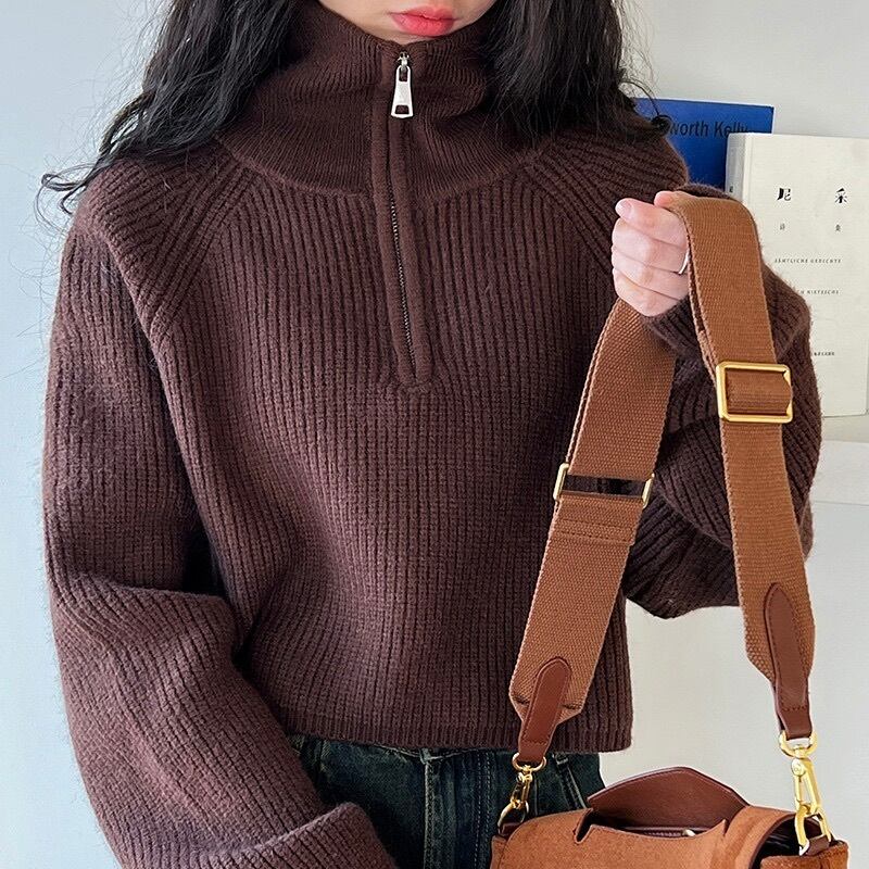 トップス プルオーバー レディース 長袖 ボリューム袖 ハイネック タートルネック ハイウエスト ジッパー ハーフジップ ニット リブニット かわいい 大人可愛い きれいめ シンプル カジュアル 上品 おしゃれ かっこいい レトロ こなれ感 ラフ ガーリー クール ベーシック アメリカン アクティブ ナチュラル 無地 お出かけ アウトドア キャンプ 休日 重ね着 体型カバー 普段使い 着回し レイヤード トレンド 定番 ゆったり ゆる フリーサイズ 白 ホワイト 黒 ブラック 茶色 ブラウン レッド