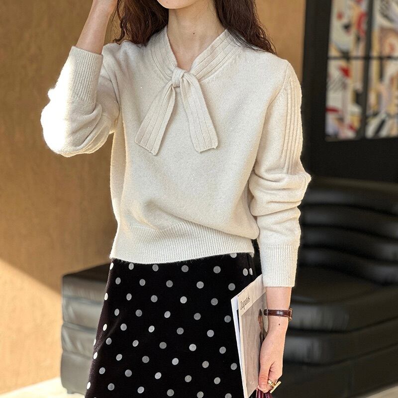 トップス セーター レディース 長袖 Vネック りぼんタイ フェミニン コンサバ ニット かわいい 大人可愛い きれいめ シンプル 上品 おしゃれ レトロ こなれ感 ガーリー エレガント モダン 抜け感 キュート 都会的 クラシカル ベーシック ロマンティック ナチュラル 無地 授業参観 MTG ミーティング ママ オフィス デート お出かけ イベント 旅行 レストラン 休日 カフェ 婚活 重ね着 韓国 オルチャン 普段使い 着回し レイヤード 清楚 定番 フリーサイズ クリーム 水色 ブルー レッド