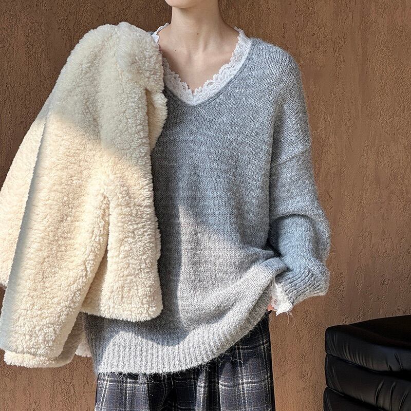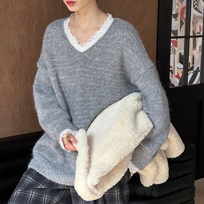 トップス セーター レディース 長袖 Vネック 切り替え ドッキング フェミニン 重ね着 レース かわいい 大人可愛い きれいめ シンプル カジュアル 上品 おしゃれ レトロ こなれ感 ガーリー エレガント 抜け感 ヴィンテージ ラブリー キュート クラシカル ロマンティック ナチュラル デート お出かけ イベント レストラン 女子会 休日 ショッピング カフェ 韓国 オルチャン 普段使い 着回し レイヤード モテ 清楚 トレンド 流行 インスタ映え ゆったり ゆる フリーサイズ 茶色 ブラウン グレー