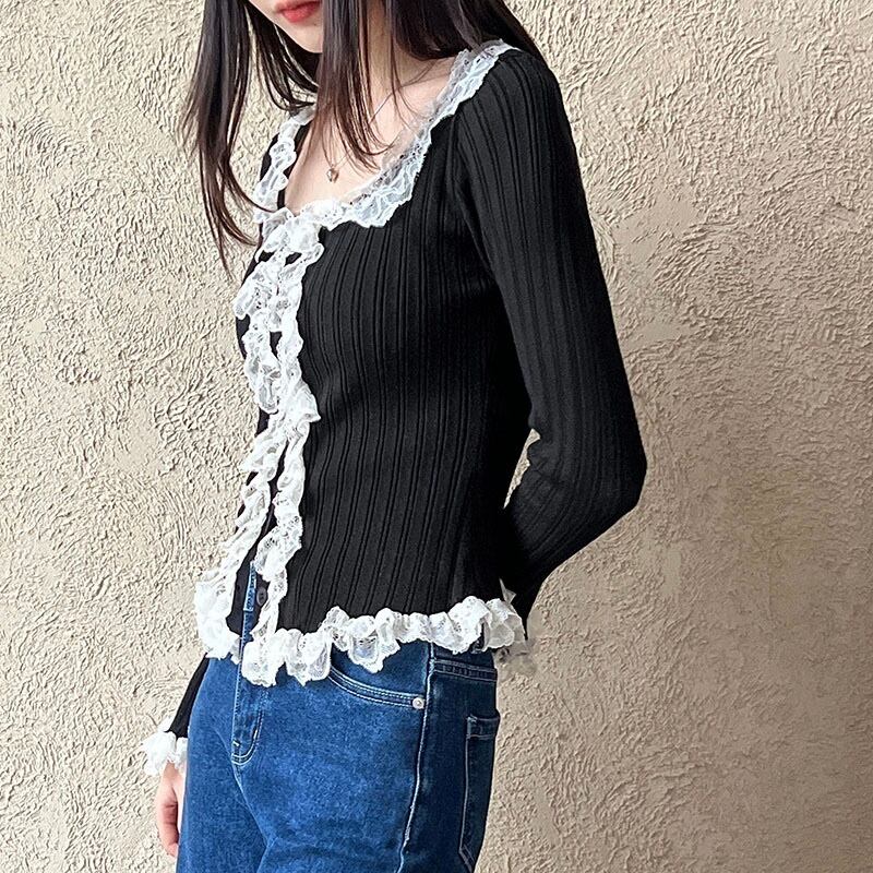 トップス ニット セーター レディース 長袖 タイト スリム 細身 切り替え ドッキング フェミニン レース フリル ヴィンテージ 異素材ミックス かわいい 大人可愛い きれいめ おしゃれ レトロ ガーリー ラブリー キュート ゴシック ロリータ プリンセス ラグジュアリー クラシカル ロマンティック デート お出かけ イベント 休日 コンサート ライブ モノトーン 重ね着 韓国 オルチャン 普段使い 着回し レイヤード トレンド 流行 インスタ映え フリーサイズ 白 ホワイト 黒 ベーシックカラー