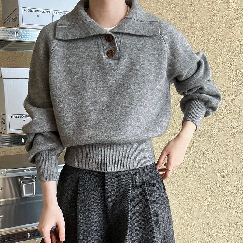 トップス ニット セーター プルオーバー レディース 長袖 ボリューム袖 襟付き 角襟 ハイウエスト リブ ボタン ヴィンテージ きれいめ シンプル 上品 おしゃれ かっこいい レトロ ラフ メンズライク マニッシュ ボーイッシュ クール 抜け感 キュート カレッジ風 ベーシック アメリカン ナチュラル 無地 お出かけ イベント 旅行 休日 ショッピング カフェ 重ね着 韓国 オルチャン 楽ちん 体型カバー 普段使い 着回し レイヤード トレンド 流行 定番 フリーサイズ 白 ホワイト グレー ブルー